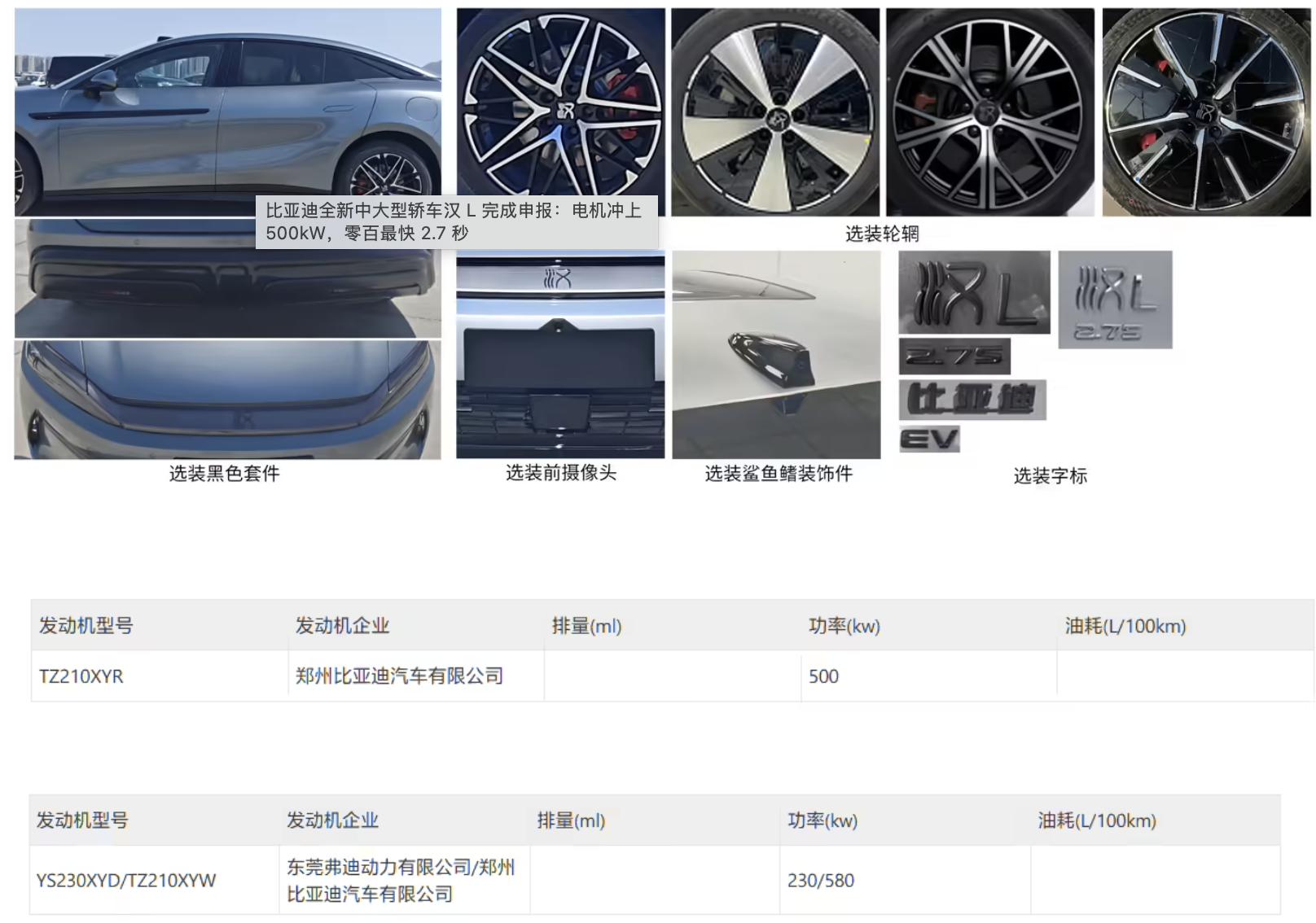 首先就是漢L,在申報圖片中,漢L的尾標數(shù)字是2.7S,熟悉比亞迪的小伙伴都知道,作為一個不是很深沉的汽車品牌,比亞迪從多年之前開始,就喜歡給自家的性能新車標上百公里加速時間,生怕別人誤會車主,覺得這是一臺普通版車型,所以這款漢L的百公里加速時間是2.7S,非常炸裂的加速能力。