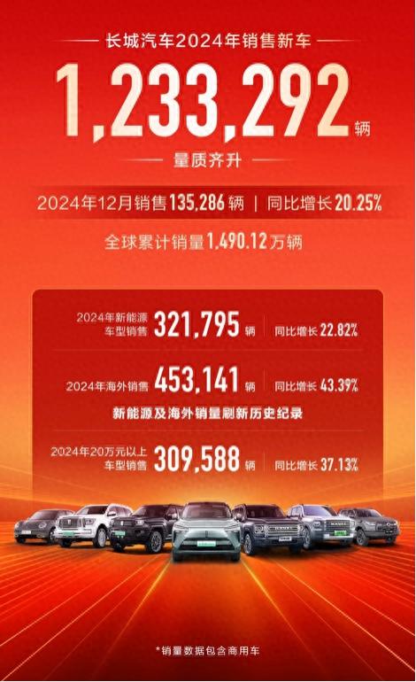 全年的成績單上,也呈現(xiàn)出全新的變化。2024年,長城汽車銷售新車123.3萬輛,其中,新能源車型銷量32.2萬輛,同比增長22.82%;海外車型銷量45.3萬輛,同比增長43.4%;20萬元以上車型銷量30.9萬輛,同比增長37.1%。