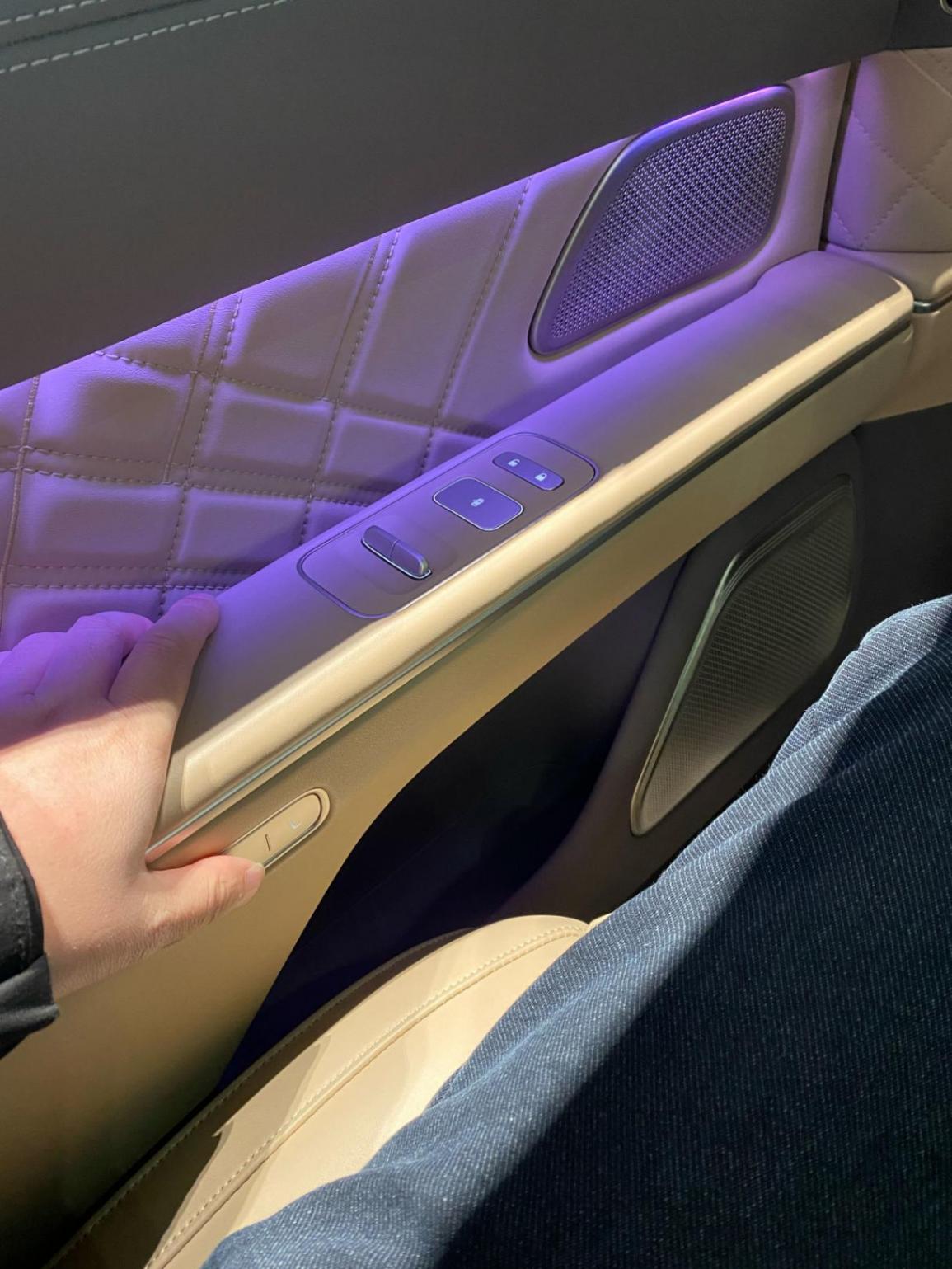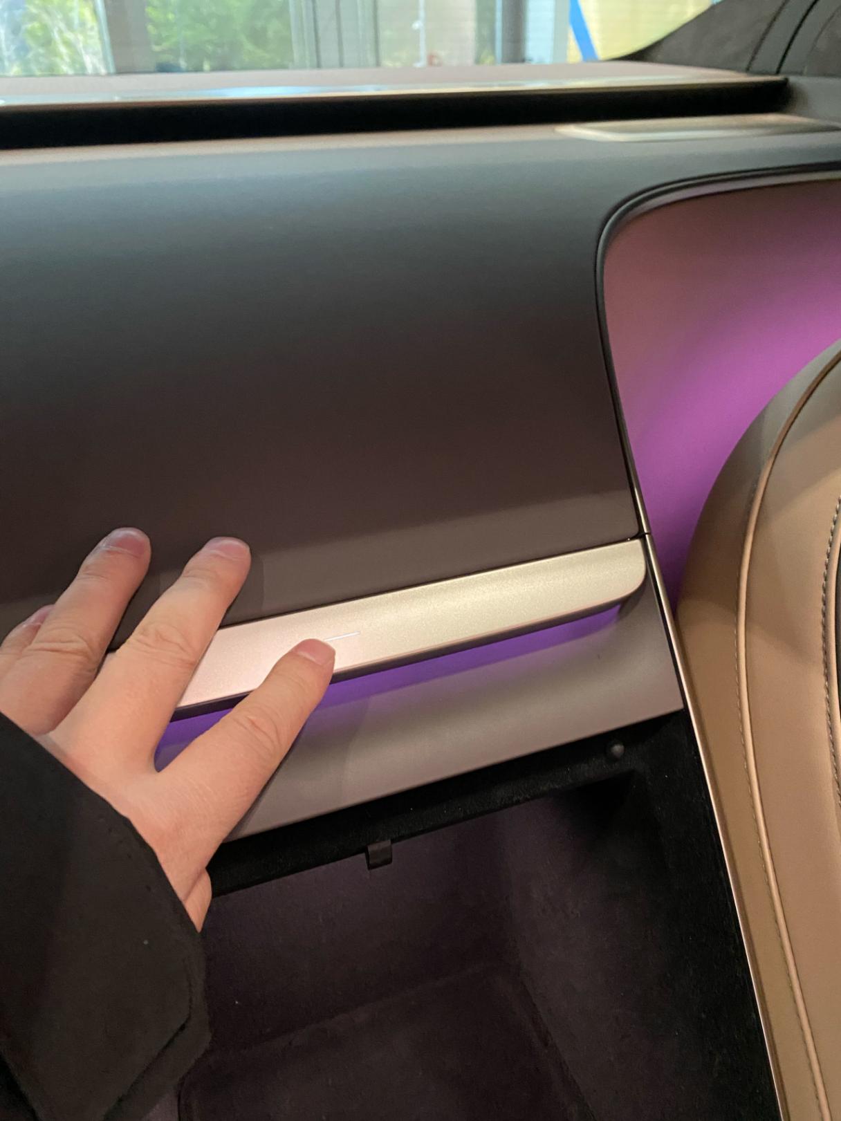 ET9這次使用的是電動加電吸門,只需要摁一下按鈕就可以自動開閉門。相比其他電動門很重這個缺點,ET9即使手動操作就跟普通機械門一樣絲滑,沒有任何卡頓,讓你感受不到是電動門。既然是電動門,ET9在門和頂棚上做了兩個按鈕,頂棚上的按鈕主要是考慮到門打開后,你坐在車內拉不到門時的操作。坐在前排試了一下,以我172cm的身高去夠打開的門也是一點問題都沒有,很多SUV和MPV門打開后,你還要把身體往外探一點才能夠到拉手。再加上ET9的手動開閉也比較絲滑,這個門用起來是真的方便。