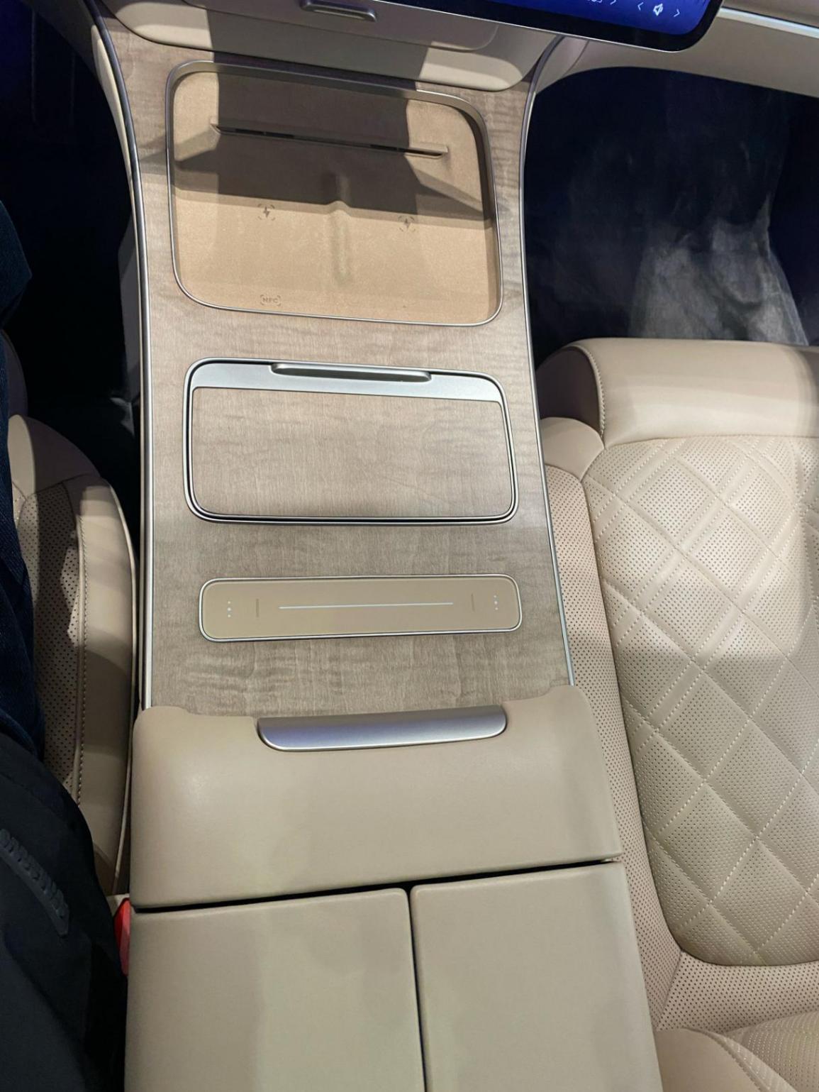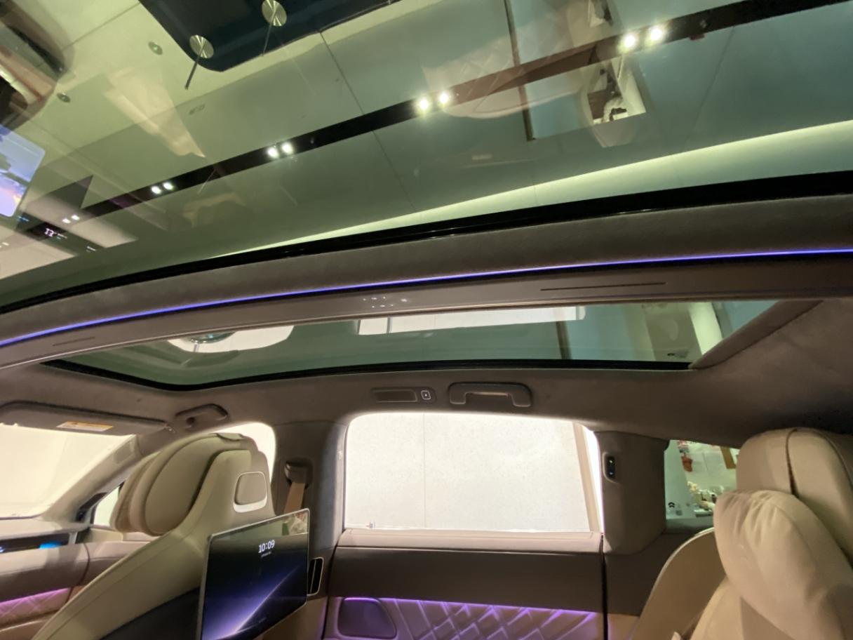 ET9并沒有去做一體式的全景大天幕,而是在玻璃車頂在中間一分為二,兩邊的遮陽簾可以單獨控制,互不打擾。當全景天幕剛出來時,其實很多人更擔心車頂在遇到事故時的碰撞安全,而ET9使用的這種結構相當于起到了一個加強的作用。當然能這樣做的前提是,必須要有一個更寬的車頂尺寸,否則經過中間那么大一塊遮擋,兩邊剩余的透光空間就不多了。所以你會看到ET9的寬度達到了2017mm,不但超過奧迪霍希、奔馳邁巴赫,甚至也會超過即將發布的尊界S800,可能除了古斯特外,ET9應該是市面上最寬的轎車。