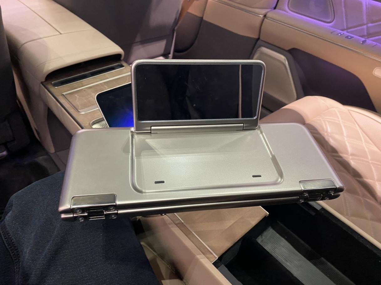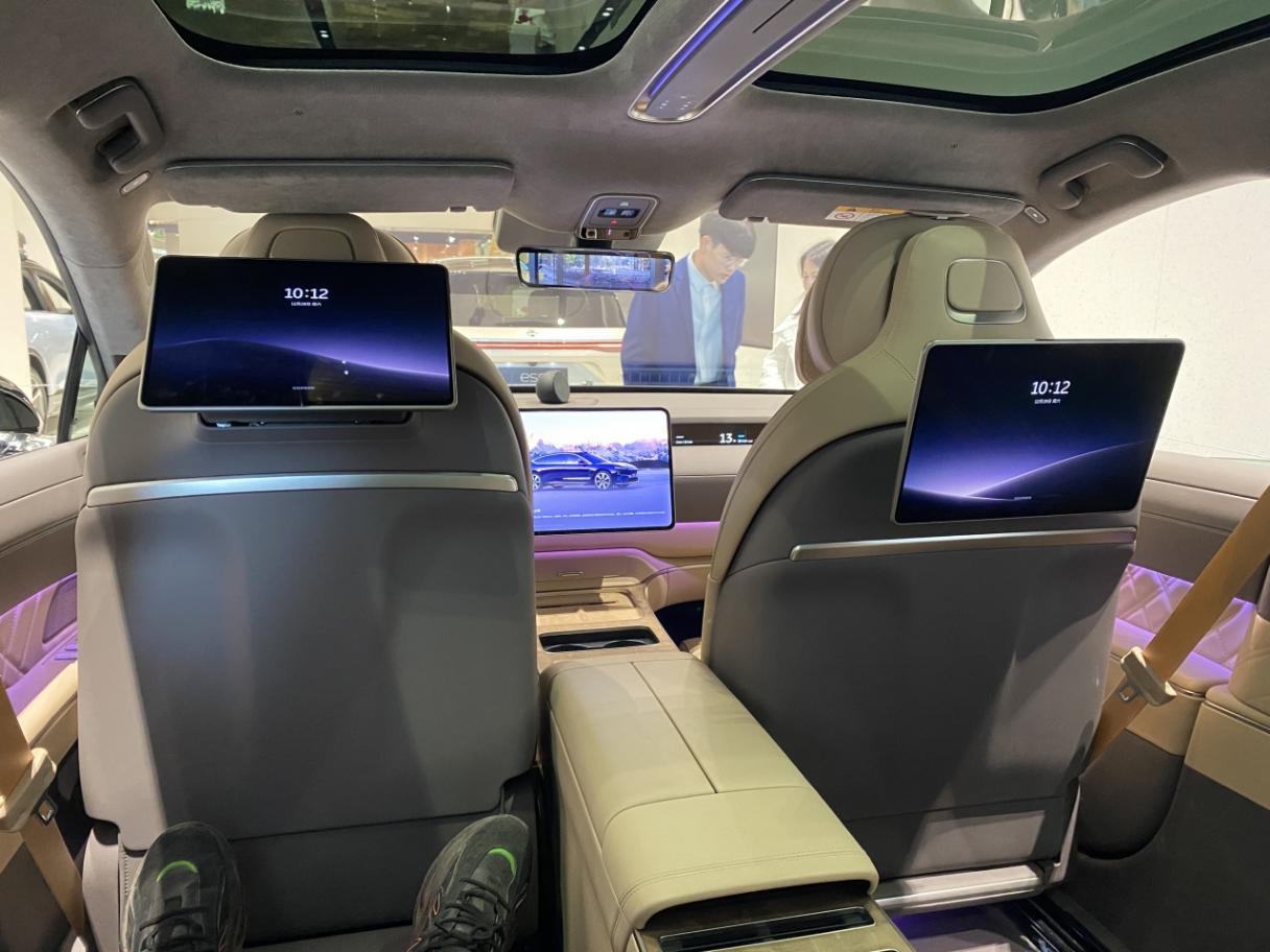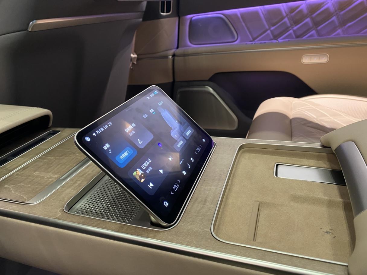 后排除了中島上的屏幕外,在前排靠背上各有一塊娛樂屏。但是兩個屏幕的控制方式不一樣,右側的可以隨著人眼識別和座椅角度的調節,自動變換屏幕的角度,這個在ET7上已經用過。但是左側的屏幕隨著座椅角度的調節還需要手動變換屏幕角度,不能隨人眼自動跟隨。