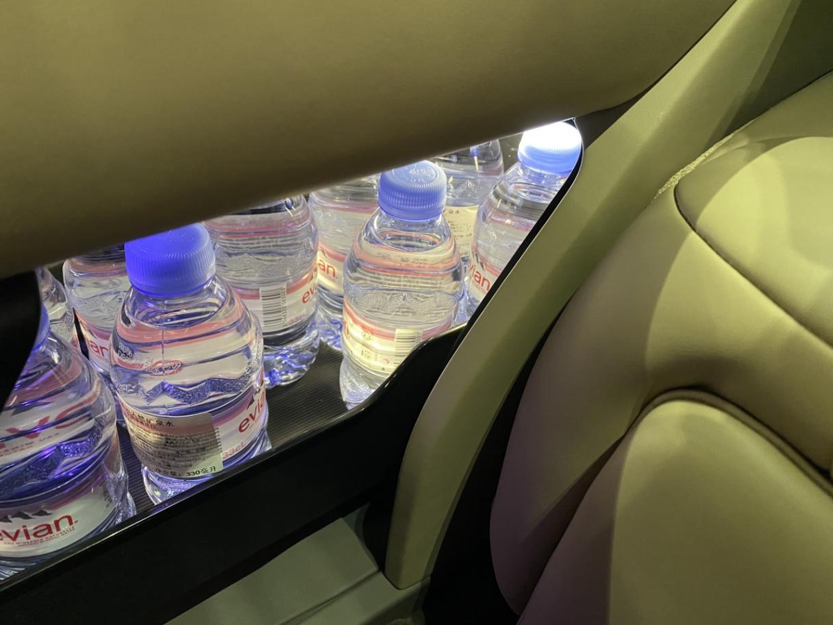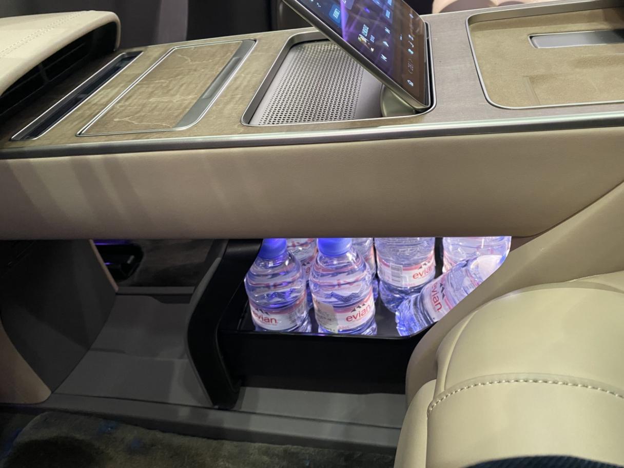 因為長長的中島臺將左右隔絕,中間也不需要坐人,ET9冰箱藏在了中島臺下,不像享界S9和騰勢Z9GT布置在中間靠背背面,也避免了像騰勢Z9GT那樣在后備箱鼓很大一個包侵占空間。所以ET9的冰箱開啟方式跟ES8有些類似,一個電動軌道將抽屜從后向前推出,像依云這種瓶子可以放五排,容積相當不錯,但想要像享界S9那樣放高度更高的紅酒,好像不太現實。最關鍵的是,當我們習慣了前排Console后端那種正面開啟的抽屜式冰箱,或者靠背后面更大的開啟門冰箱時,這種隱藏在下面的反向開方式,在取最里面一層儲物時手腕會有些別扭。