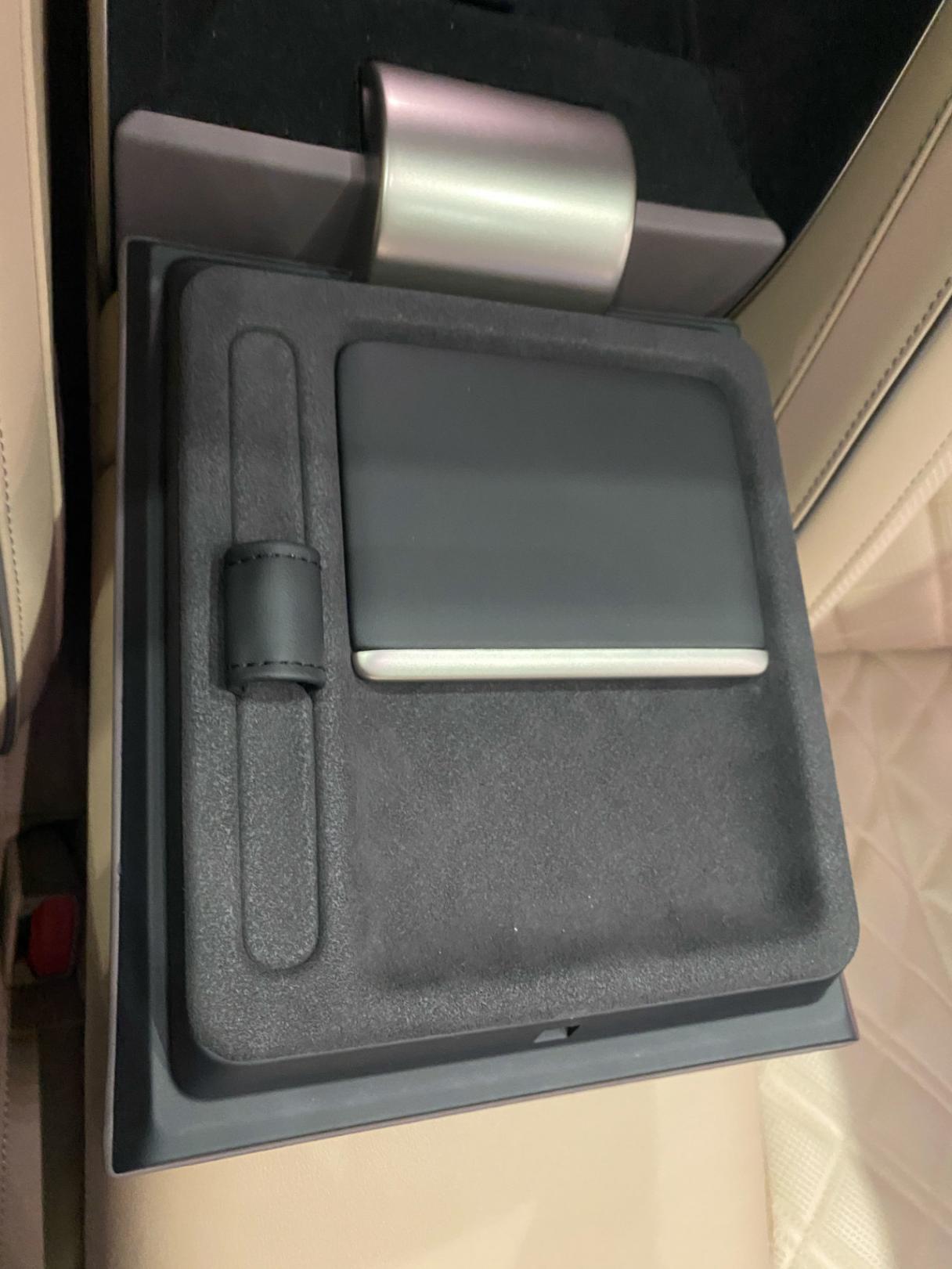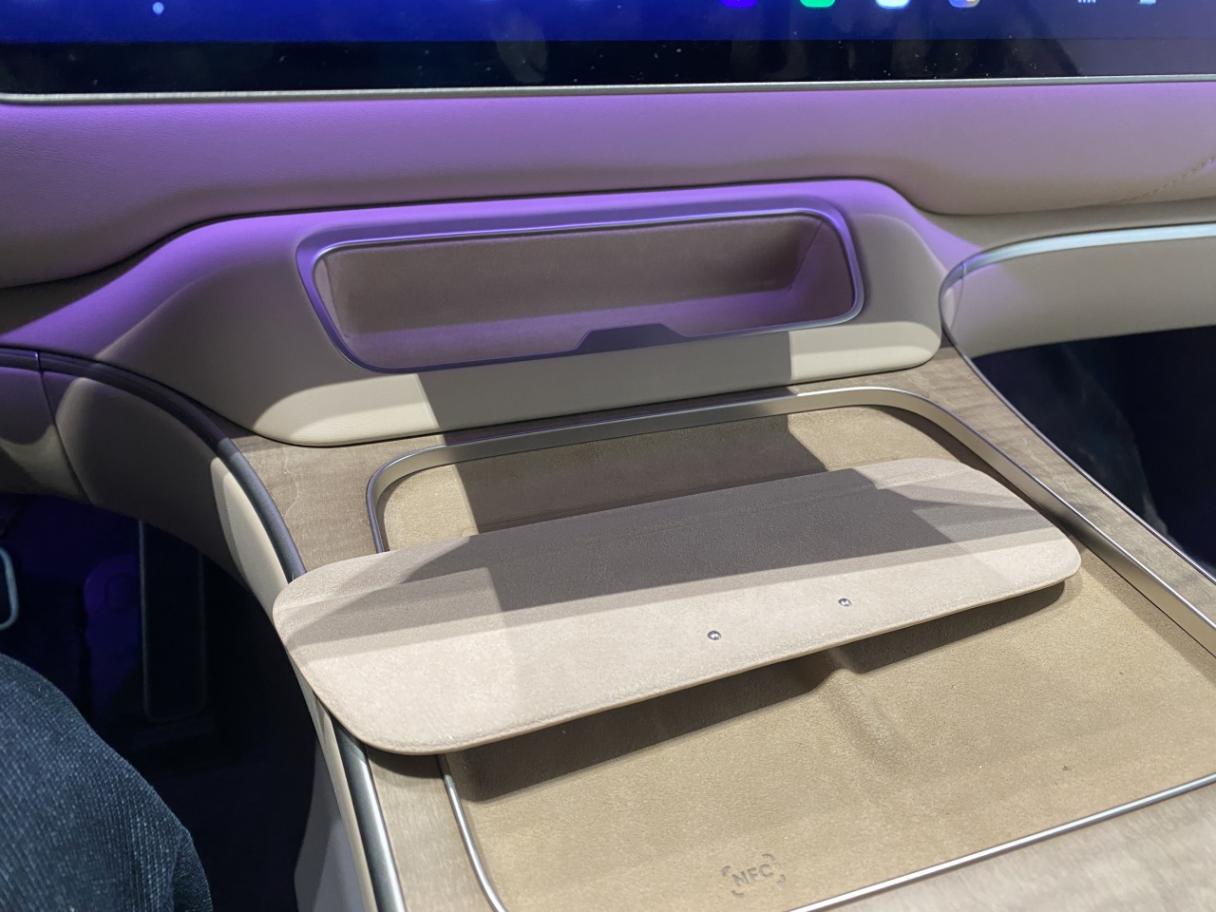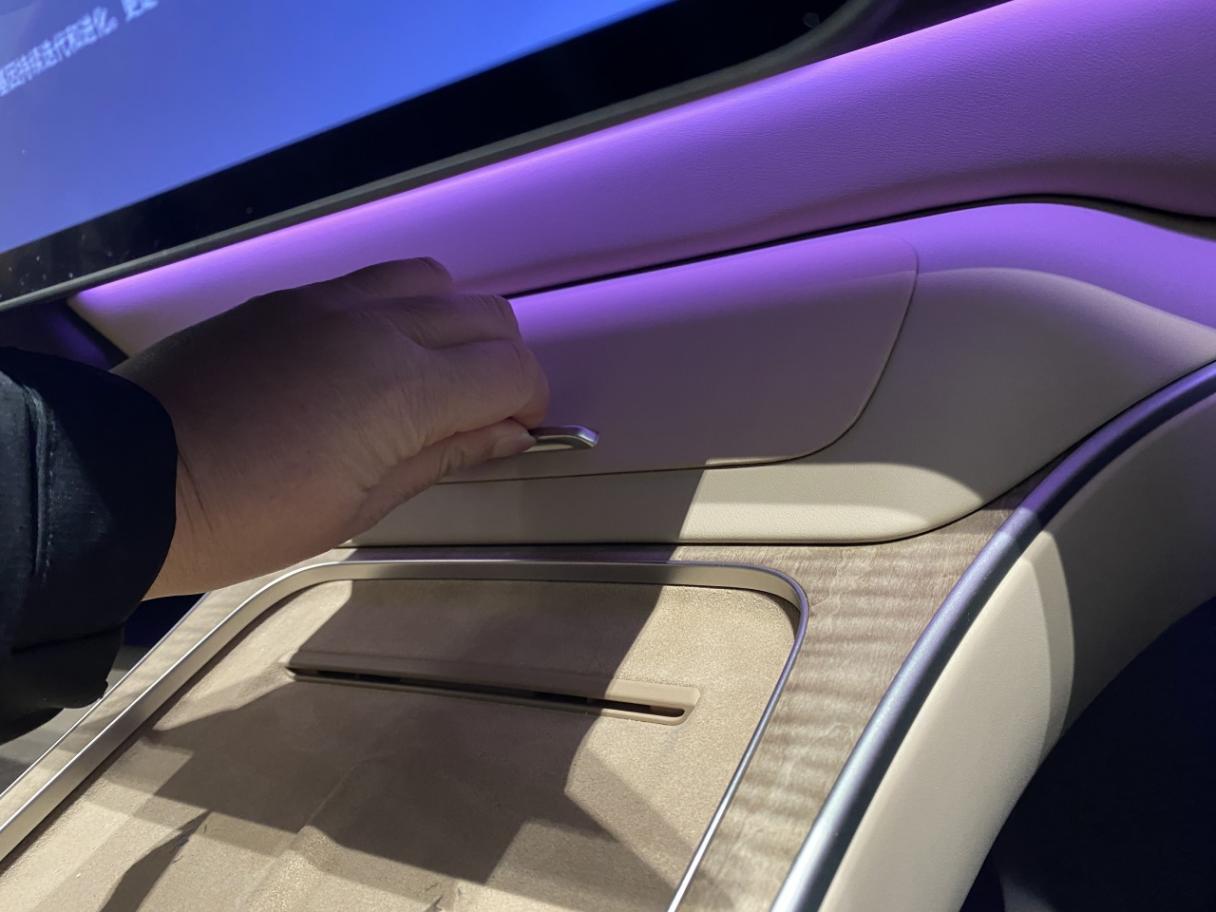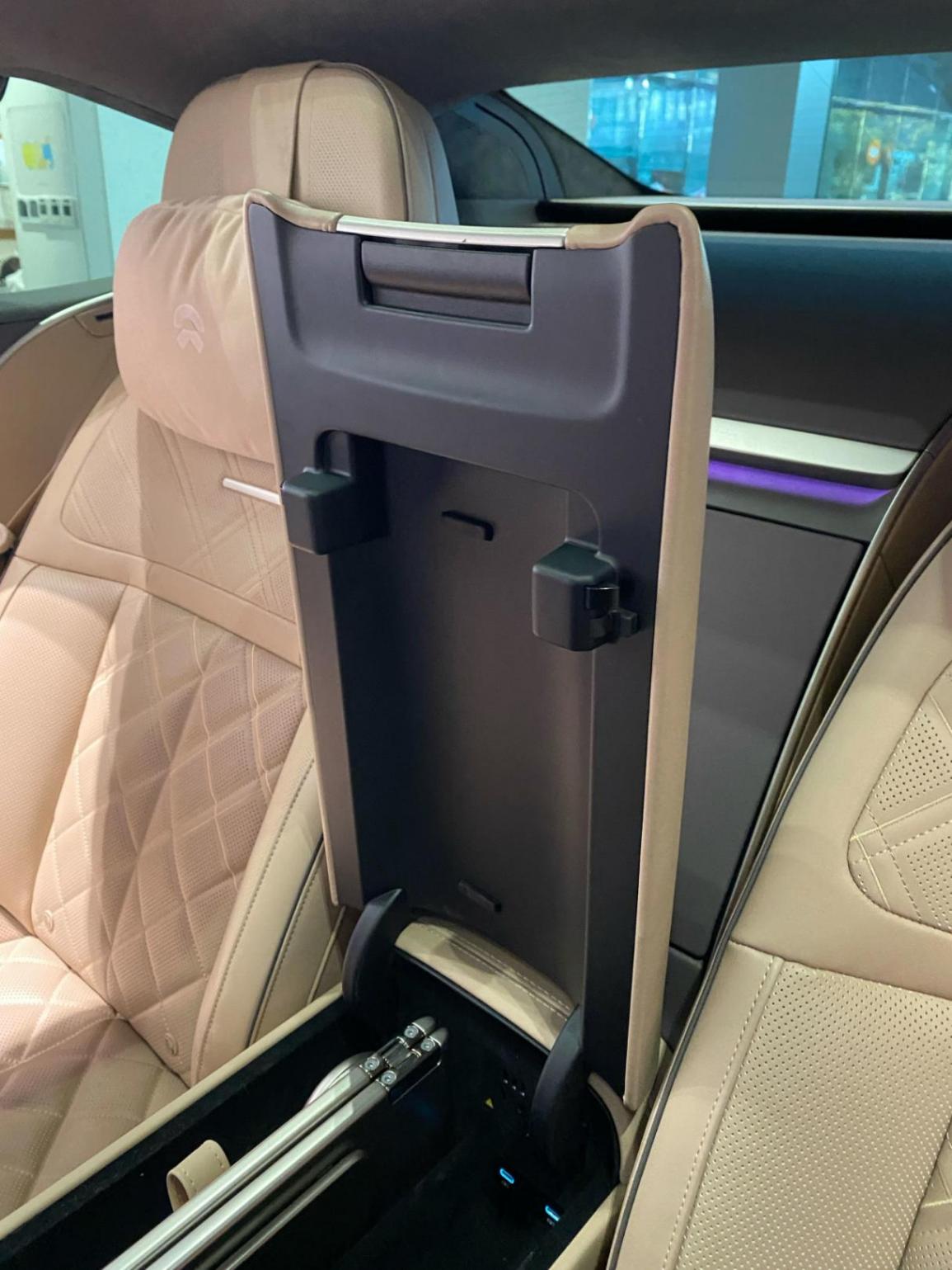 ET9在后排靠背中間位置設置了一個儲物空間,開啟按鈕是觸摸式,還可以通過后排大屏設置密碼。