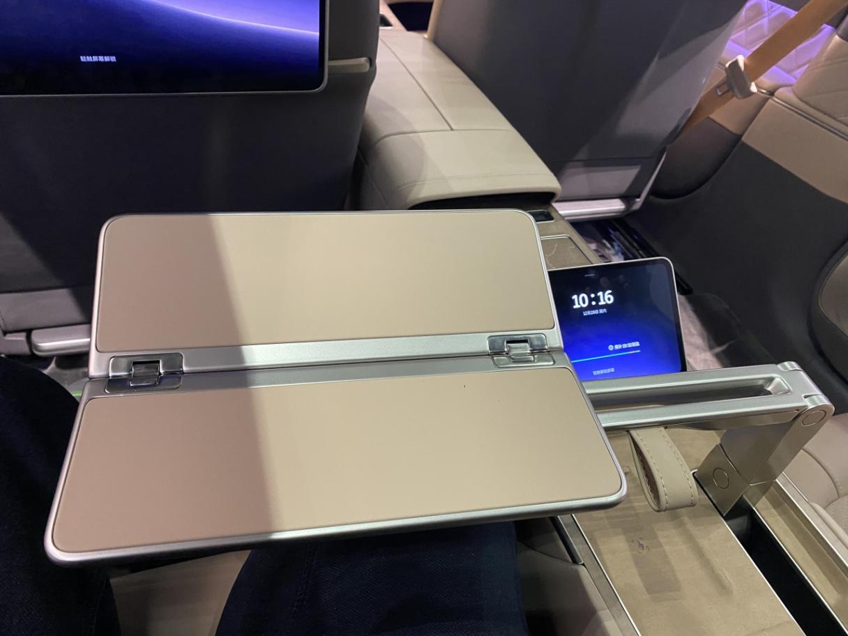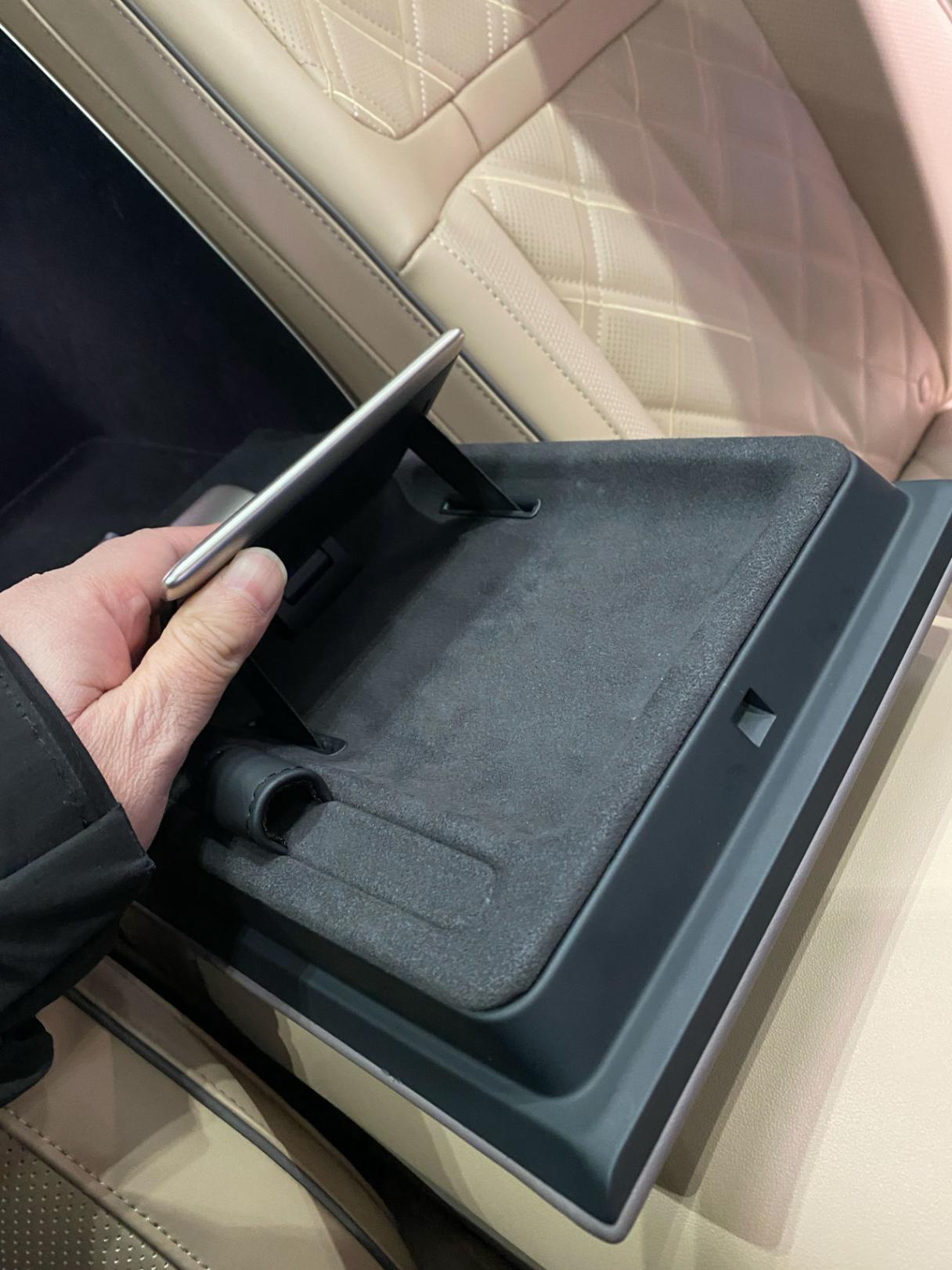 ET9在后排有一個可以收納在側面的小桌板,兩邊位置共用,畢竟同時使用這個小桌板的場景不多,如果布置兩個的話,收納時沒有足夠的位置可以隱藏。這個小桌板的樣式不太陌生,因為在極氪009、奧迪霍希、邁巴赫S級、豐田阿爾法上都有類似大小的小桌板。特殊的是,ET9兩邊共用一個后,它是依靠轉軸的自由度來變換方向,在多個自由度加持下,如果不清楚原理,第一次用時可能這個化妝鏡對不準人,不過也多了很多樂趣,感覺就像玩魔方一樣。