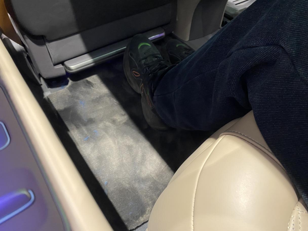前排座椅背面都帶有電動腳踏,在后排一鍵開閉的同時,腳踏也聯動開閉。與其他腳踏不一樣的是,ET9的腳踏是水平平行于車身地板的,沒有傾斜的角度,相當于當你躺倒后,與腳踏接觸的是腳跟承擔壓力,不是腳掌。好處是腳踏角度不會隨前排靠背角度調節而變化,壞處是因為不能讓腳掌整個面接觸腳踏,久放后的舒適性值得考量。