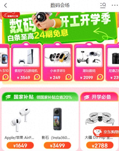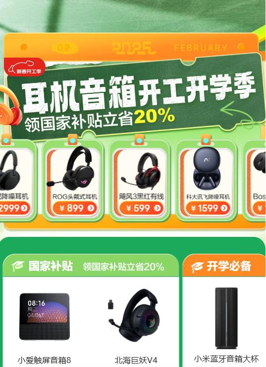 2 月 5 日消息,隨著 2025 春節結束后返工返校,京東今日上線了數碼開學季、音頻開學季會場,今日(2 月 5 日)到 2 月 28 日,購買部分數碼和音頻類產品,領國家補貼可立省 20%。