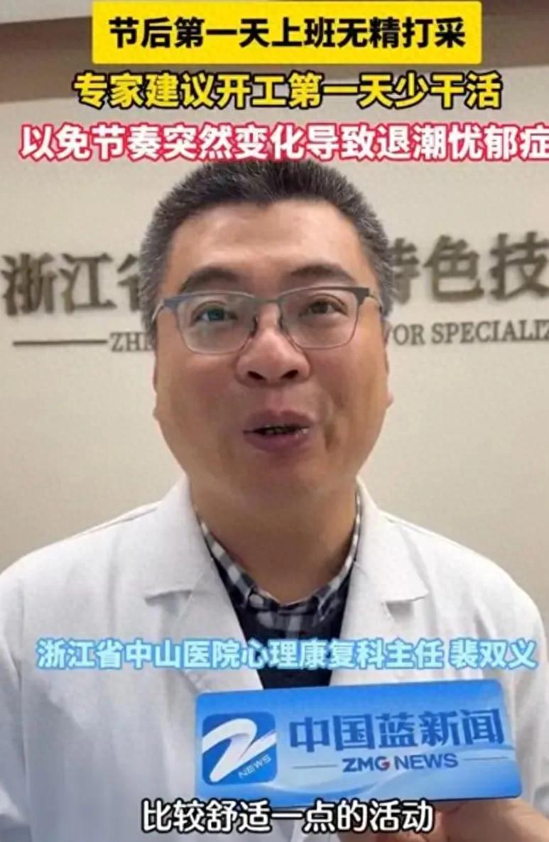 為了應對春節假期后“戒斷反應”的困擾,專家們給出了幾條緩解壓力的建議。浙江省中山醫院心理康復科主任裴雙義指出,在春節后的第一個工作日,大家應該從輕松的工作任務開始,不要一開始就給自己增加過多的壓力。“開工第一天,少干點活,適當減輕自己工作強度,可以有效防止‘退潮憂郁癥’的發生。”