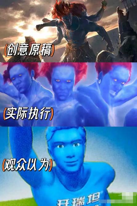 在《封神第二部》沒有公映前片方釋出的概念圖中,殷郊復(fù)活后的法相還在觀眾的認可范圍內(nèi),至少跟片中其他神仙的樣子比較搭。但等到電影上映后,觀眾被紅發(fā)藍體的殷郊法相逗樂了。