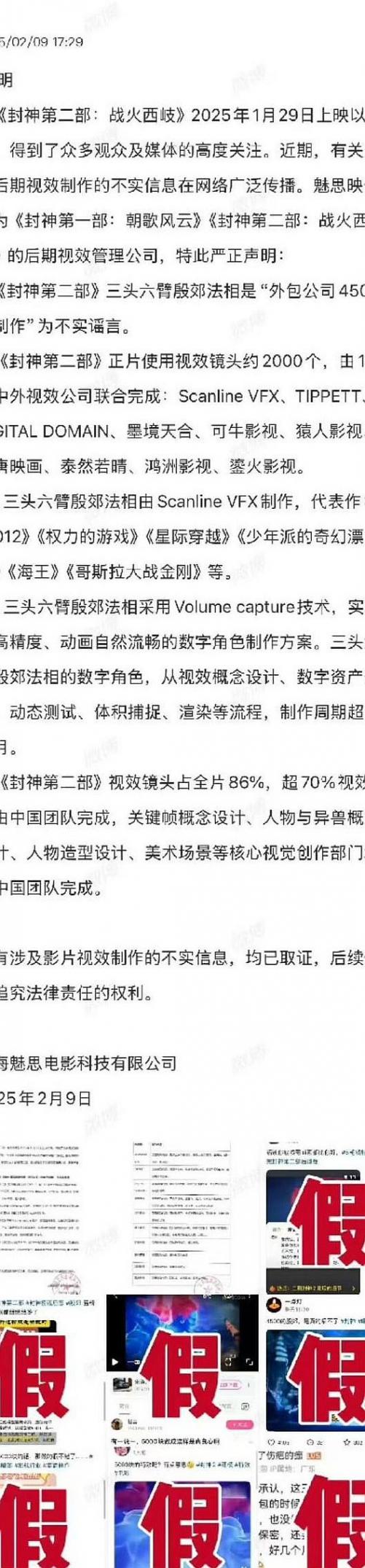 當(dāng)《封神第二部:戰(zhàn)火西岐》在2025年1月29日上映后,殷郊法相的三頭六臂造型迅速成為觀眾熱議的焦點(diǎn)。然而,伴隨著贊譽(yù)而來(lái)的,還有關(guān)于后期視效制作的不實(shí)信息。這些傳言聲稱,殷郊法相的制作被外包給了其他公司,甚至質(zhì)疑影片的整體視效質(zhì)量。面對(duì)這些質(zhì)疑,魅思映像在2月9日發(fā)布了一份詳盡的聲明,不僅澄清了事實(shí),還向公眾展示了影片視效制作的復(fù)雜過(guò)程與團(tuán)隊(duì)的努力。
