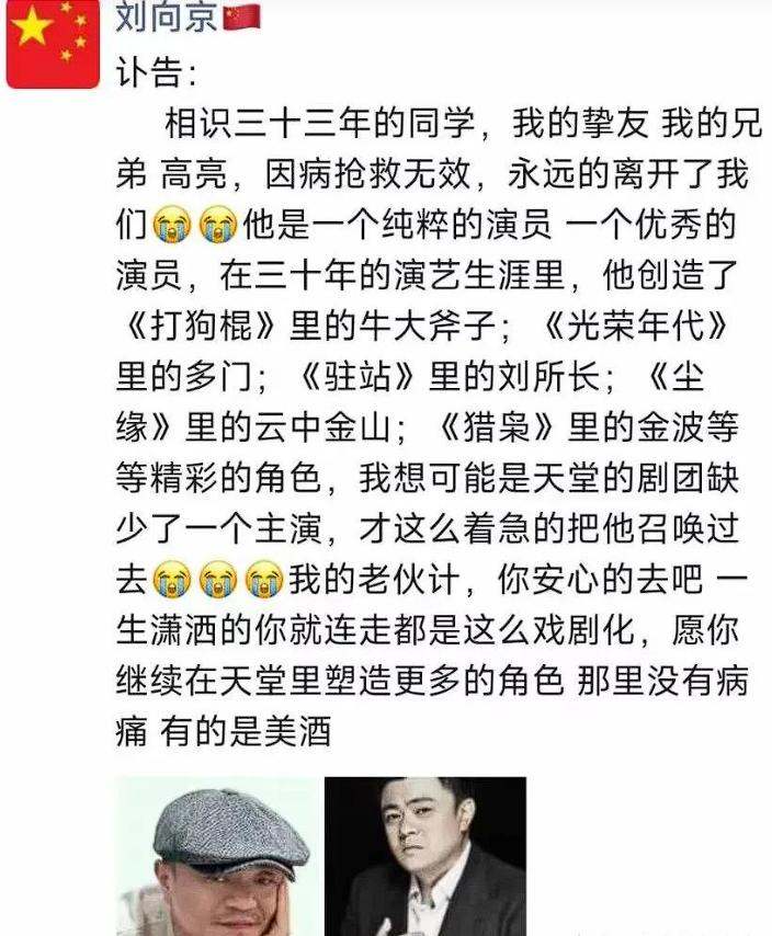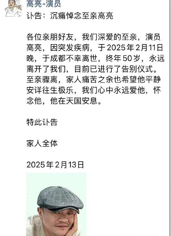 2025年2月11日,演員高亮在成都因病去世,終年50歲。據知情人士透露,高亮是因突發肝病,在經過長達十幾天的奮力搶救后,最終還是未能戰勝病魔,不幸離世。