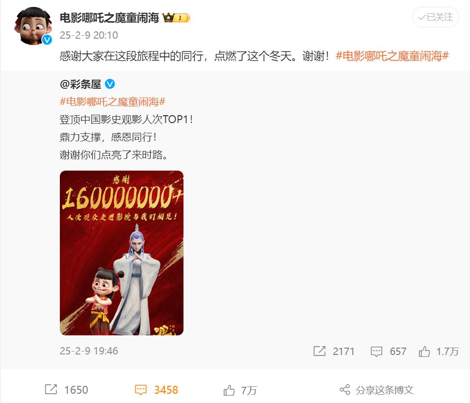 截至2月9日19時21分,《哪吒2》觀影人數(shù)累計達1.6億人次,打破了由《戰(zhàn)狼2》保持的中國影史累計觀影人次紀錄,用時11天13時21分。接著,官方微博配發(fā)海報,感謝160000000位觀眾。