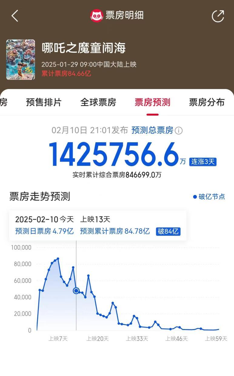 照現(xiàn)在這形勢,《哪吒2》票房破100億妥妥的。燈塔專業(yè)版預(yù)測,《哪吒2》票房將超過110億元。貓眼預(yù)測超過140億元。現(xiàn)在還有人預(yù)測,票房能達到150億元,僅次于《泰坦尼克號》。
