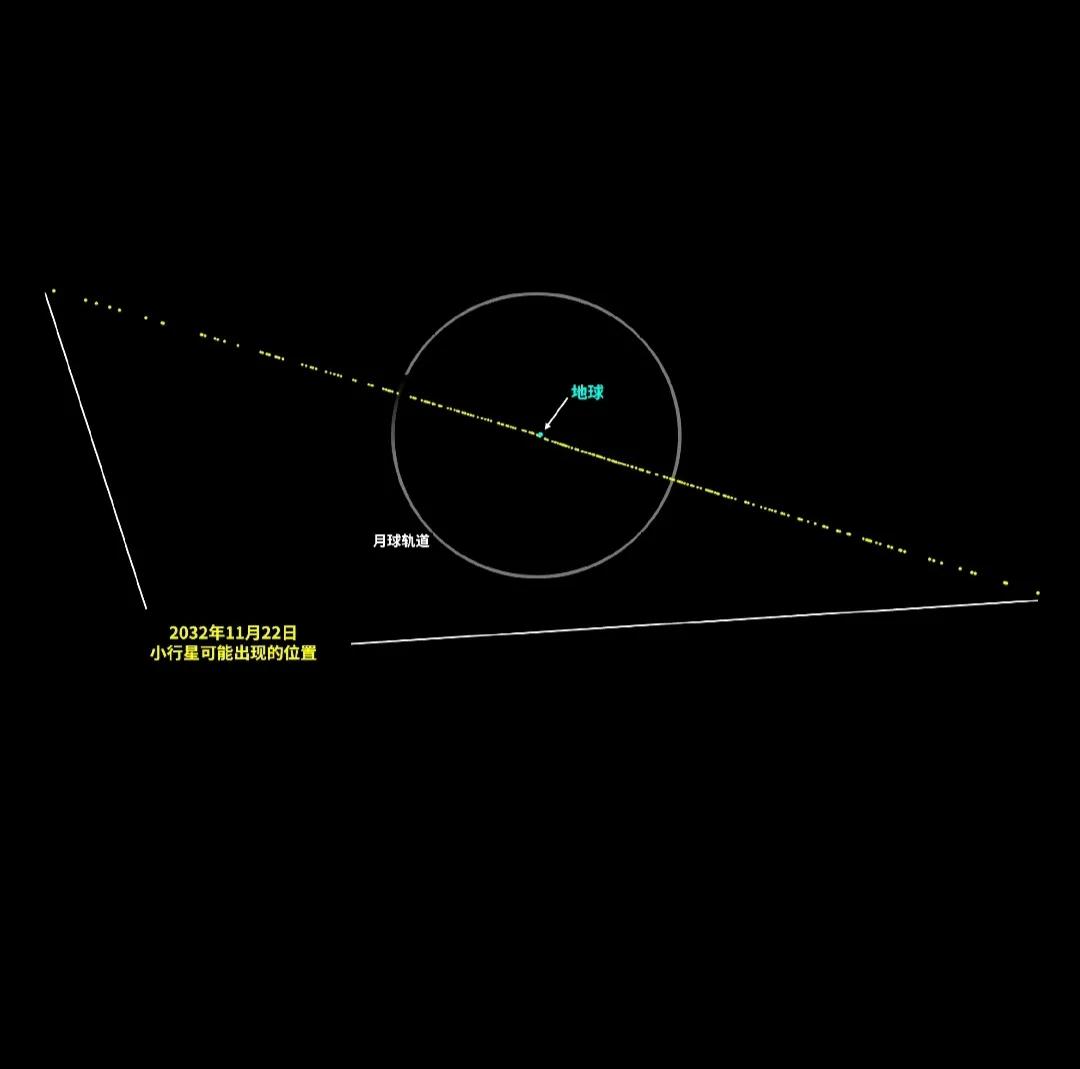 這里直觀給大家展示一下,下圖黃色點即為小行星在2032年12月與地球交匯時可能出現的位置(因為軌道測量有誤差,所以暫時不能準確確定)