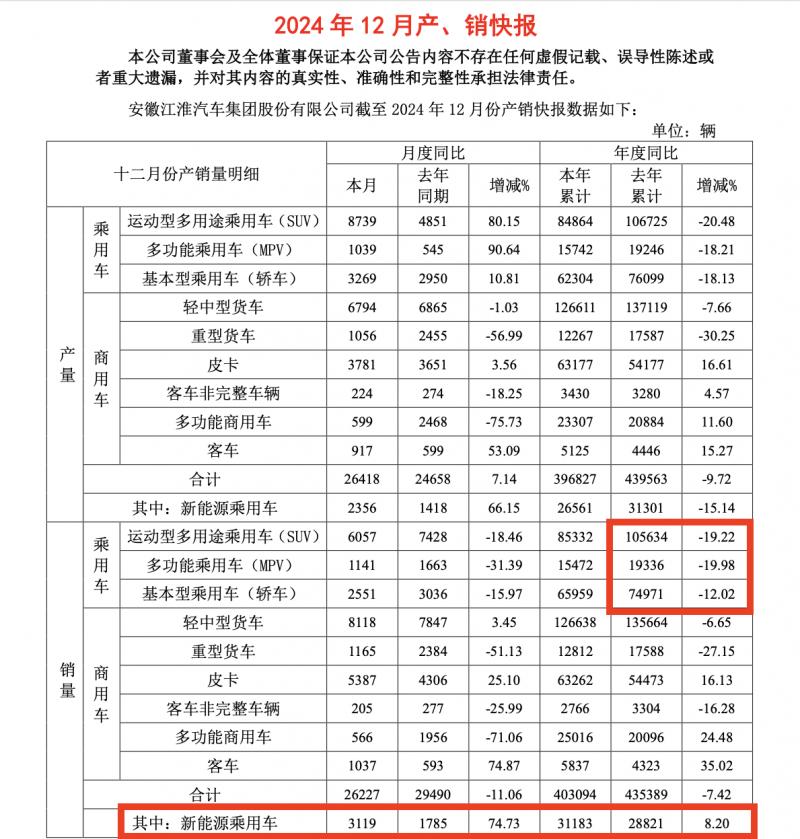 在先后與新能源和傳統(tǒng)燃油車領(lǐng)域的兩家一流車企合作后,江淮在乘用車領(lǐng)域的表現(xiàn)依舊微弱。江淮發(fā)布的2024年產(chǎn)銷快報顯示,乘用車版塊全年銷量為166763輛,同比下跌16.6%。其中,新能源乘用車銷量31183輛,僅相當于頭部新能源車企一個月的銷量。