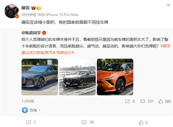 汽車博主陳震也參與到該話題的討論,陳震表示:“我個人覺得咱們的車牌本身并不丑,看著別扭只是因為前車牌的面積太大了,影響了整個車前臉的設計語言,而且前臉越尖、越氣動、越運動的,影響越大。”