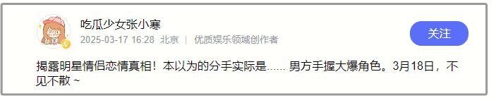 前一天,狗仔張小寒預(yù)告明星情侶的戀愛(ài)真相,稱本以為兩人已分手,實(shí)則另有乾坤,并透露男方手握大爆角色。