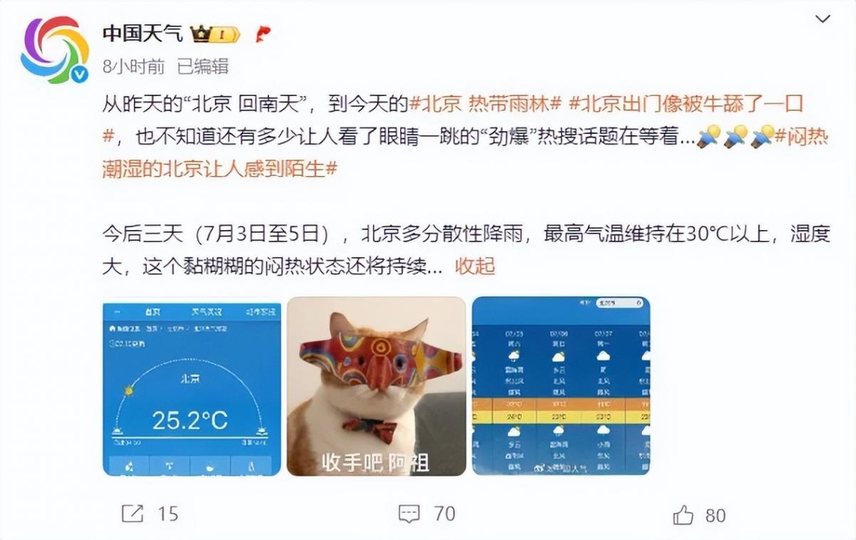據中國天氣介紹,今后三天(7月3日至5日),北京多分散性降雨,最高氣溫維持在30℃以上,濕度大,這個黏糊糊的悶熱狀態還將持續。