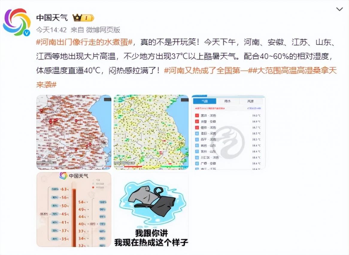 據中國天氣介紹,今天下午,河南、安徽、江蘇、山東、江西等地出現大片高溫,不少地方出現37℃以上酷暑天氣。配合40~60%的相對濕度,體感溫度直逼40℃,悶熱感拉滿。