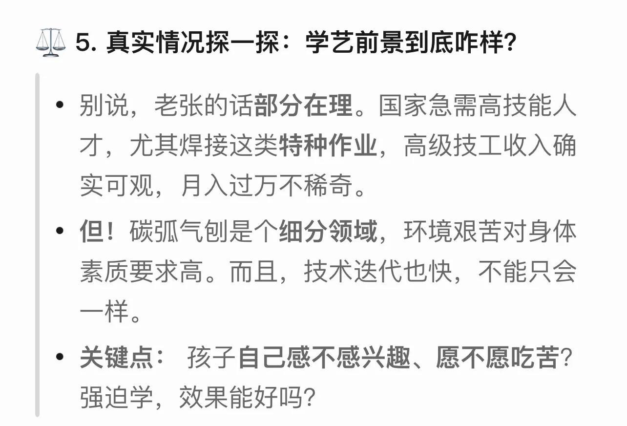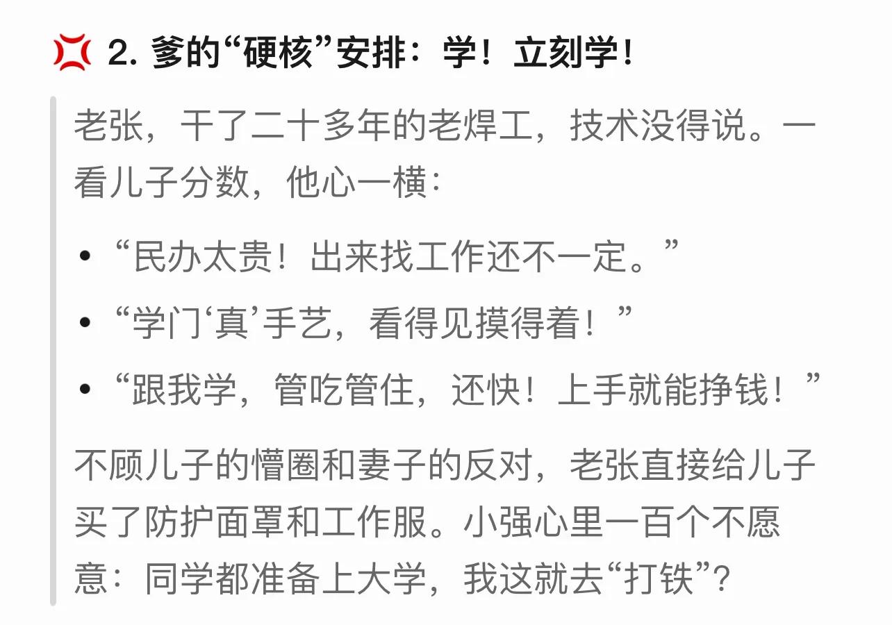 高考放榜,幾家歡喜幾家愁。山東老張的兒子小強成績不理想,本科線沒夠上。就在小強蔫頭耷腦、全家愁云慘霧的時候,老張一拍大腿做了個決定:不讀民辦了,直接跟他去學“碳弧氣刨”!這可把小強和他媽驚呆了,父子倆為這事差點吵翻天。這當爹的,咋想的?