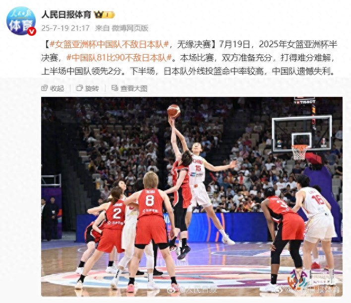 7月19日,2025年女籃亞洲杯半決賽,中國隊81比90不敵日本隊。本場比賽,雙方準備充分,打得難分難解,上半場中國隊領先2分。下半場,日本隊外線投籃命中率較高,中國隊遺憾失利。 ???