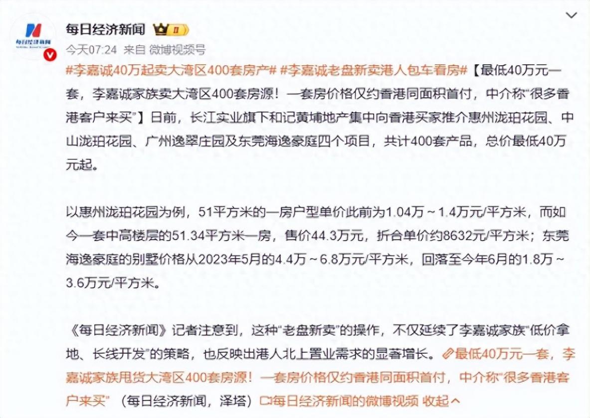 《每日經濟新聞》記者注意到,這種“老盤新賣”的操作,不僅延續了李嘉誠家族“低價拿地、長線開發”的策略,也反映出港人北上置業需求的顯著增長。O最低40萬元一套,李嘉誠家族甩貨大灣區400套房源!一套房價格僅約香港同面積首付,中介稱“很多香港客戶來買” (每日經濟新聞,澤塔)