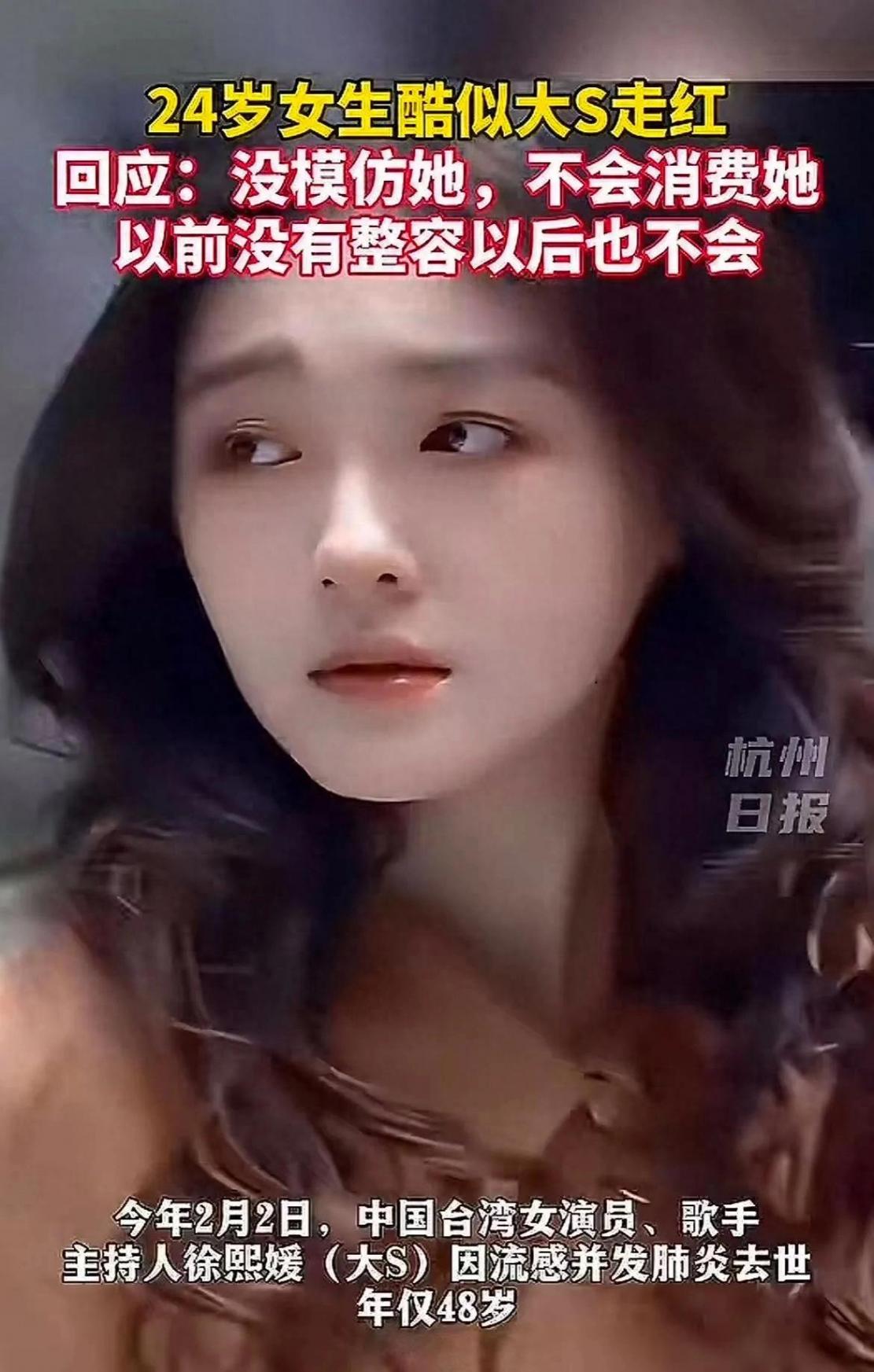 當(dāng)一個人長的和明星酷似并不是稀奇事,但是因為大S的突然離世,讓很多網(wǎng)友以及大S的粉絲意難平,不僅因為她那些膾炙人口的作品,還有才49歲,對于現(xiàn)代人的平均壽命來說,可以說年紀(jì)輕輕就走了。