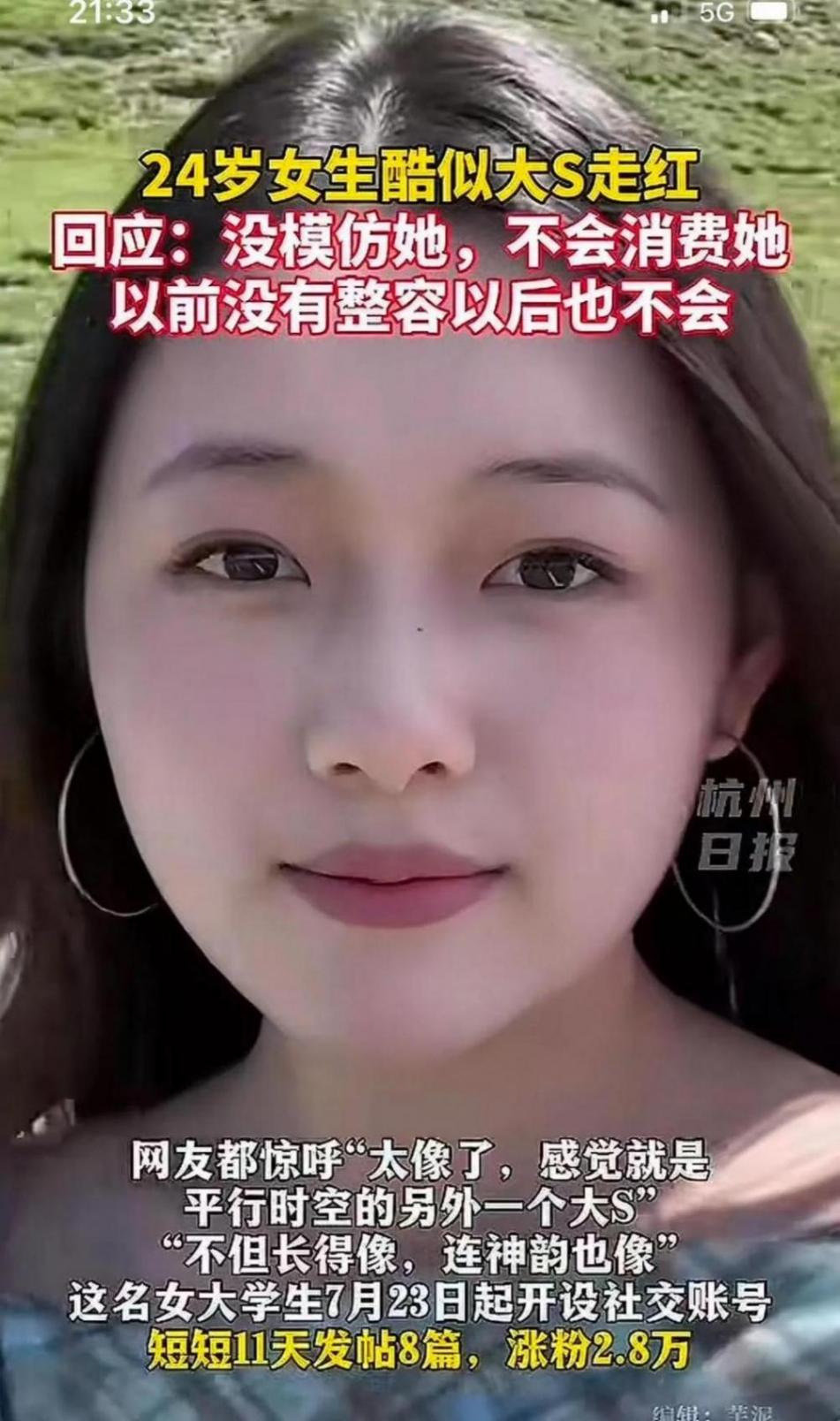 近日,一名24歲的重慶醫(yī)科大學(xué)女大學(xué)生因為長的和大S幾乎80%相似,在網(wǎng)上引起了網(wǎng)友們的熱捧。