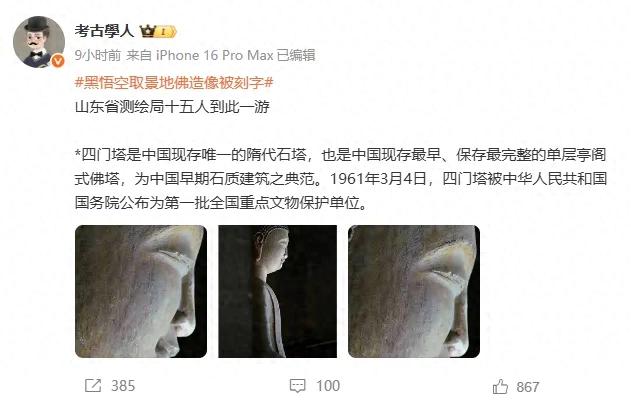 7月17日,有網(wǎng)友稱山東濟南四門塔一造像側(cè)臉被刻上“某省測繪局十五人到此一游”字樣,該網(wǎng)帖被某考古大V轉(zhuǎn)發(fā),引發(fā)關注。