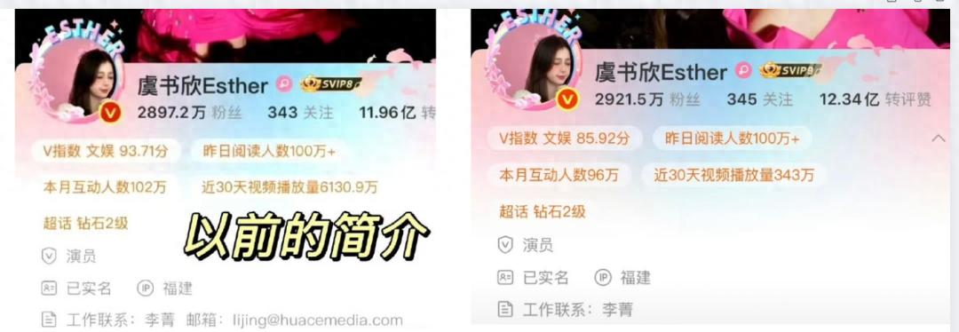 7月31日,有網(wǎng)友發(fā)現(xiàn)虞書欣上線修改了微博主頁(yè)簡(jiǎn)介,刪除了原簡(jiǎn)介中“華策影視”官方郵箱和經(jīng)紀(jì)人李菁聯(lián)系方式,只保留了經(jīng)紀(jì)人姓名。此舉引發(fā)網(wǎng)友熱議,猜測(cè)是虞書欣與華策影視合作關(guān)系變動(dòng)的信號(hào)。