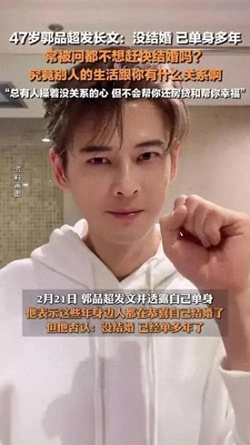 視頻中,郭品超以調(diào)侃語氣回應(yīng)外界對他婚姻狀況的猜測。此前,他因與小19歲的女演員馬澤涵的戀情備受矚目,2021年官宣時曾透露已購置婚房,計劃2022年結(jié)婚,但這段感情最終無疾而終。2023年起,兩人互動逐漸減少,郭品超悄悄刪除了為馬澤涵慶生的照片和公開戀情的帖子。今年2月,他更通過長文明確表示“單身多年”,感慨人生無常,并分享了獨(dú)自醉心戶外運(yùn)動、專注新戲拍攝的心境。