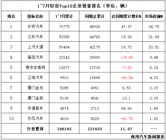 再看排名情況,與6月相比,7月輕客Top10排名發(fā)生了較大變化。其中,排名上升的企業(yè)有3家,分別是上汽大通由上月第三升至本月第二,江淮汽車由上月第七升至本月第六,廈門金龍由上月第八升至本月第七;江鈴汽車和宇通客車本月排名下降;另有長安汽車、福田汽車、南京依維柯和廈門金旅位次未發(fā)生變化。