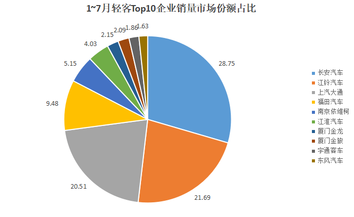 從市占率維度來看,1~7月,輕客市場(chǎng)Top10企業(yè)市占率達(dá)到97.34%,較1~6月擴(kuò)大了0.03個(gè)百分點(diǎn),變化不大。Top3市占率均超過20%,3家企業(yè)共占據(jù)70.95%的份額,較前6月略有收窄。