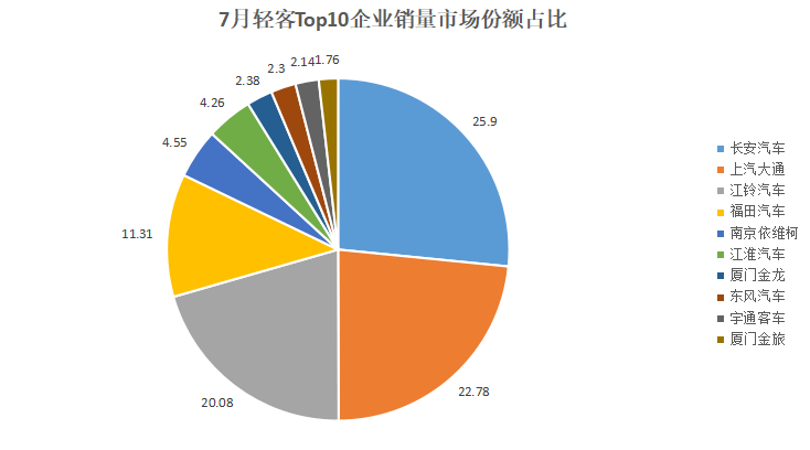 市占率維度,7月,輕客市場(chǎng)Top10企業(yè)市占率達(dá)到了97.46%,較上月擴(kuò)大了2.23個(gè)百分點(diǎn),市場(chǎng)集中度進(jìn)一步提高,尤其是Top3企業(yè)市占率均超過了20%。