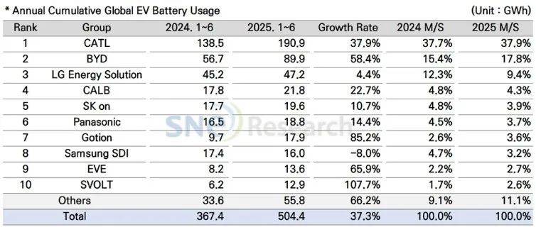 根據(jù)韓國研究機構SNE Research的最新數(shù)據(jù),2025年上半年全球電動汽車(EV、PHEV、HEV)動力電池裝機量504.4GWh,同比增長37.3%。而曾經不可一世的日韓電池廠商,市場份額進一步下滑。
