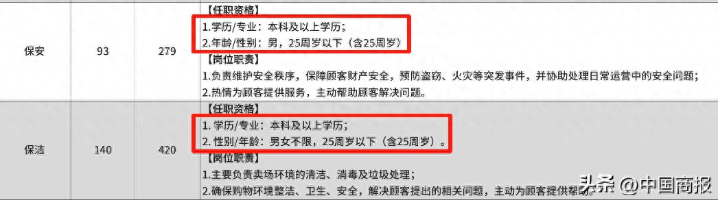 在公告中,保安、保潔崗位要求“本科及以上學(xué)歷,年齡25周歲以下”,且保安崗位僅限男性。除部分技術(shù)崗位外,公告顯示,其余崗位基本要求均為本科及以上學(xué)歷,年齡普遍限制在30歲以下。其中,保潔擬招140人、保安擬招93人。
