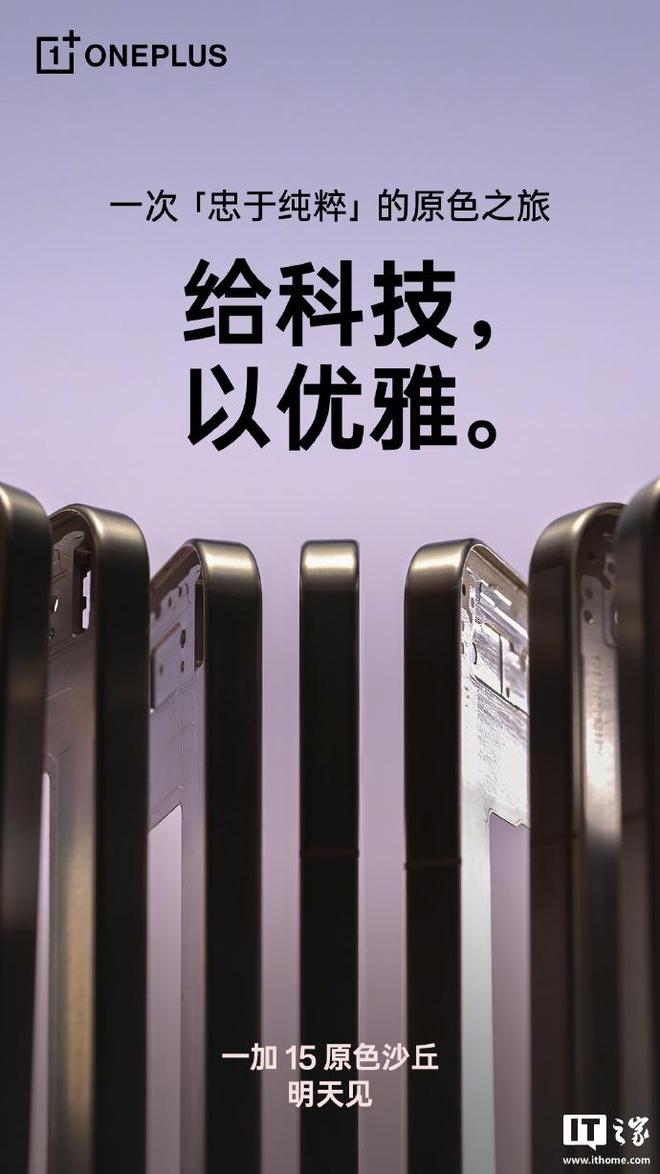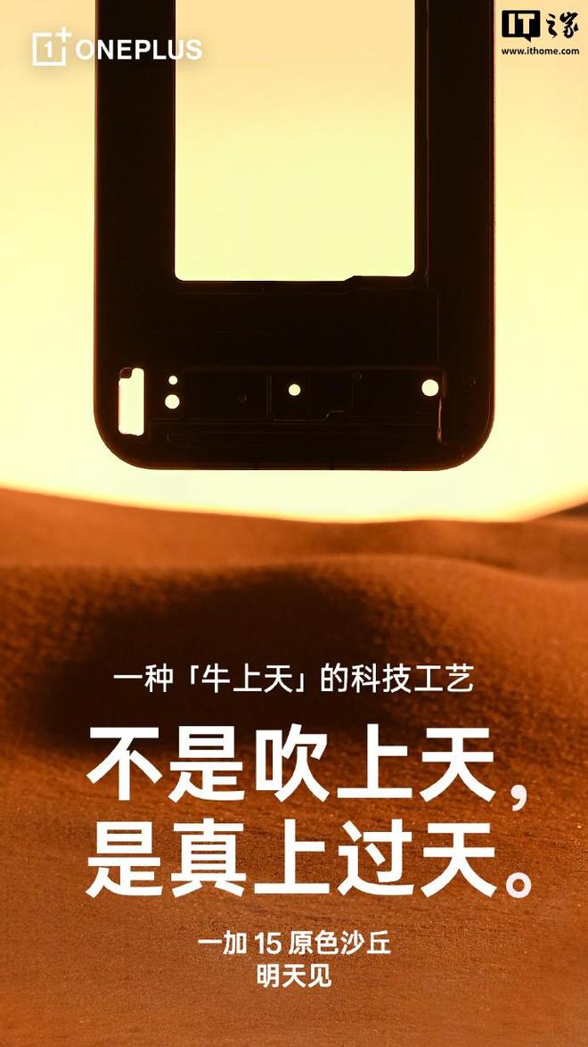 9 月 27 日消息,一加手機剛剛宣布,一加 15“原色沙丘”明天見,官方宣稱其采用一種“牛上天”的科技工藝,一場“比鈦強”的工藝煥新,一次“忠于純粹”的原色之旅。