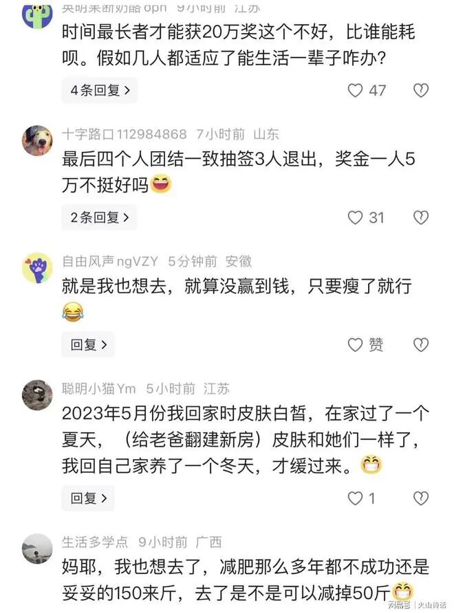 針對此事,有網友評論,時間最長者才能獲20萬獎這個不好,比誰能耗唄。假如幾人都適應了能生活一輩子咋辦?