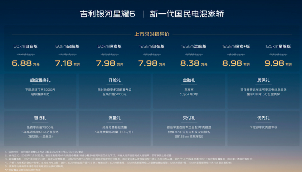 為進一步降低購車門檻,吉利還推出多重權益:11月30日前下訂可享6000元超級置換金,疊加金融禮、質保禮等政策后,實際購車成本進一步下探。這種"定價誠意+權益加碼"的組合,讓高品質電混家轎真正走進普通家庭。