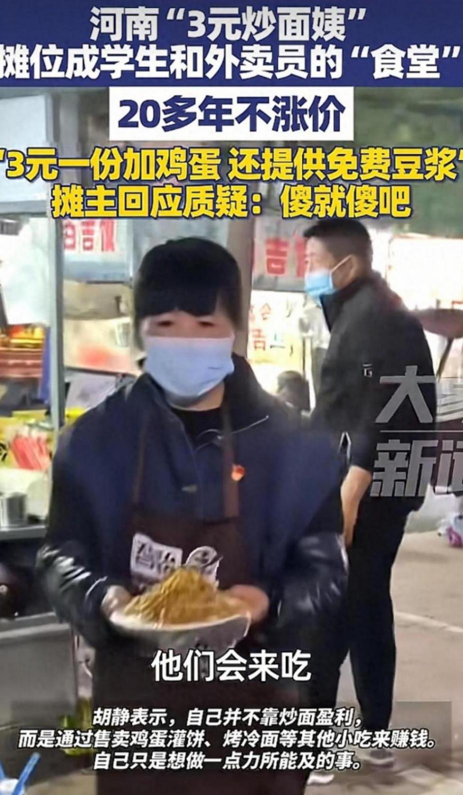 據“大象新聞”新聞的報道顯示,河南睢縣的某個街頭,一位大姐的雞蛋炒面只賣三元,甚至因為來吃炒面的是學生,還給送免費的豆漿。