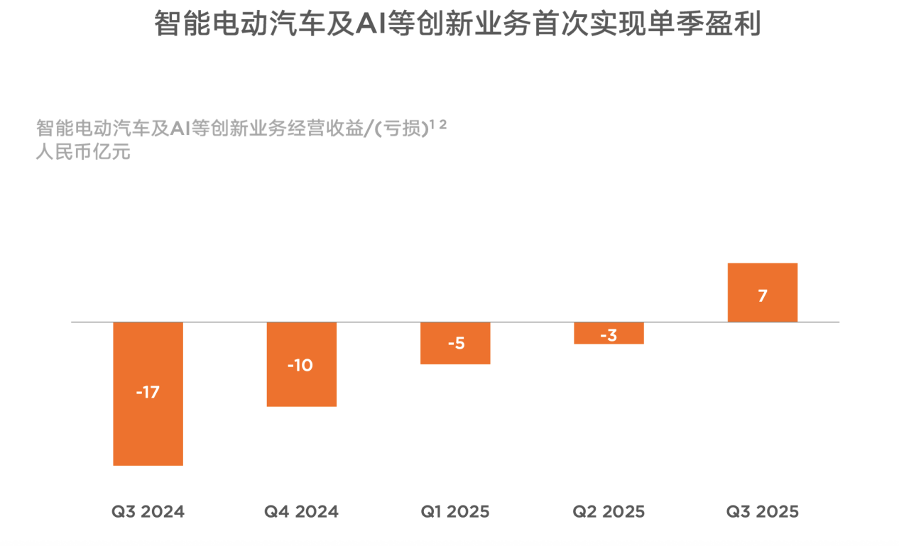 今年第一季度,小米智能電動車及AI等創新業務的收入為186億元(其中智能電動車業務收入181億元),毛利率為23.2%;第二季度營收增至213億元(其中智能電動車業務收入206億元),毛利率提升至26.4%。兩個季度內,前述業務雖未實現盈利,但經營虧損由第一季度的5億元收窄至第二季度的3億元,直至第三季度實現盈利。