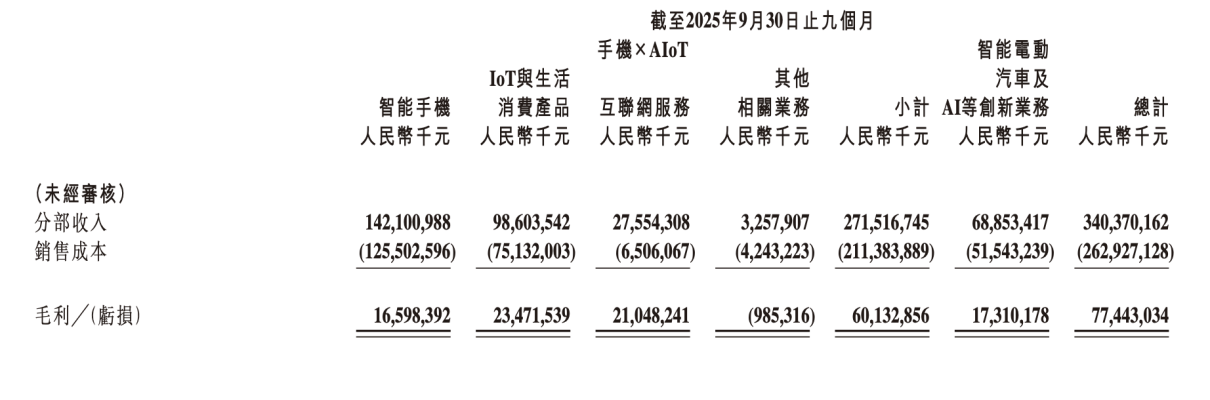 2025年前三季度小米汽車收入(圖/小米集團財報截圖)