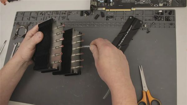 這次的實驗對象是利民Peerless Assassin風冷,其本身就擁有不錯的散熱性能,TrashBench首先拆除了散熱片,然后精確地切割了裸露的熱管頂部,將熱管內部的空腔變成了水流通道。