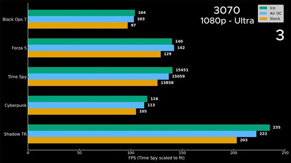 首次測試對象是MSI RTX 3070,安裝改造后的散熱器并啟動冰水循環后,3070的核心溫度達到了-14°C,在核心頻率超頻320MHz后,其性能獲得了約10%的平均提升。