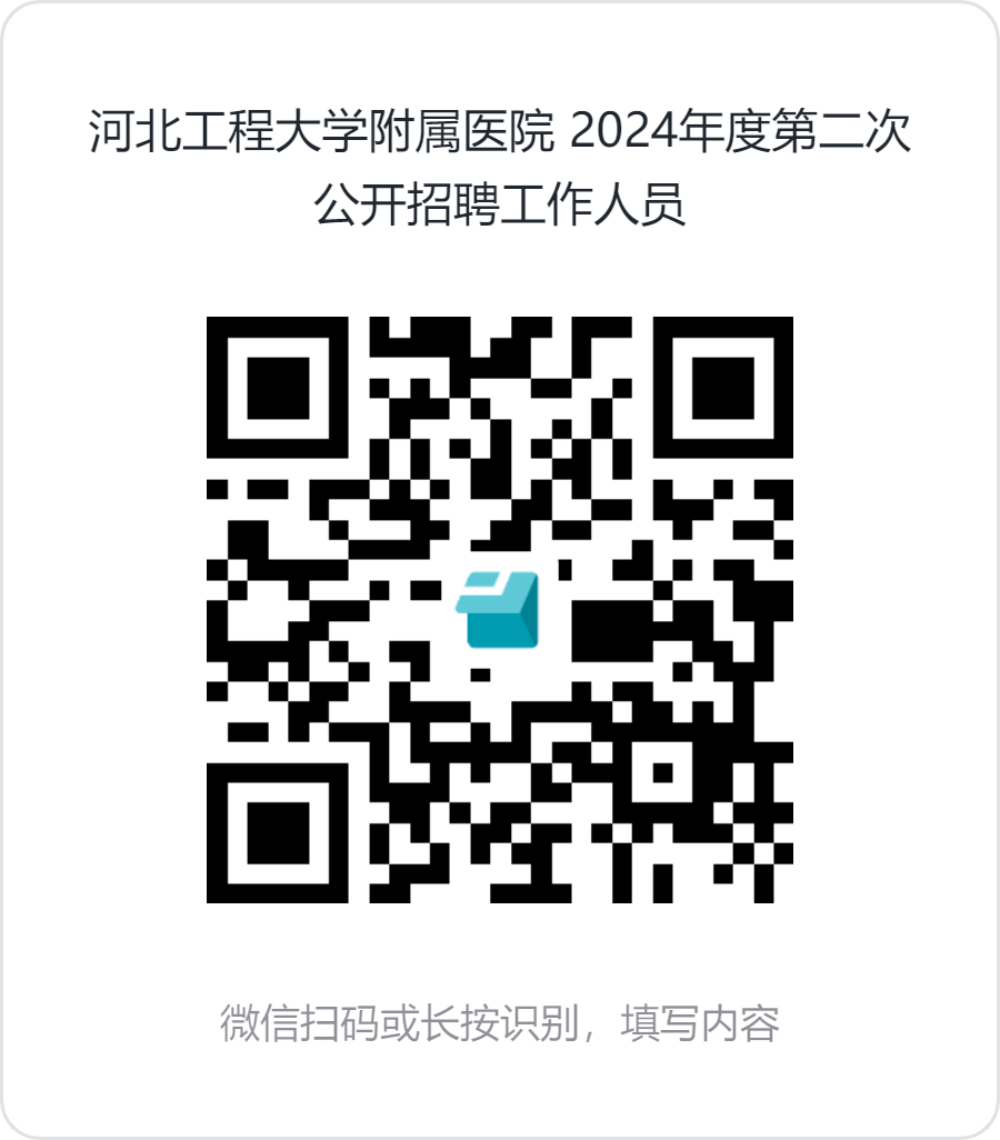 報名者掃描二維碼在線表單填寫報名信息,須從醫院官網下載填寫《河北工程大學附屬醫院2024年度第二次公開招聘工作人員報名表》(附件1),打印報名表粘貼本人小二寸照片,掃描形成PDF格式文件并上傳,文件名格式:報考崗位+姓名,大小不超過10M。