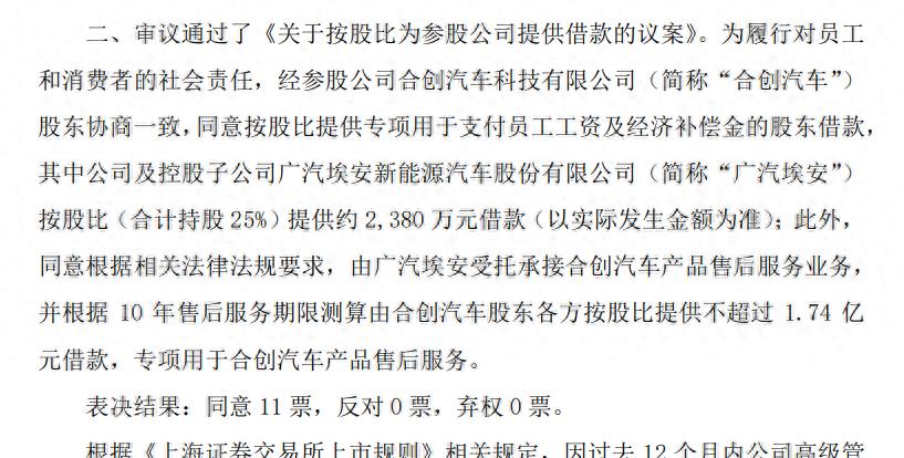 為履行對(duì)員工和消費(fèi)者的社會(huì)責(zé)任,經(jīng)參股公司合創(chuàng)汽車科技有限公司(簡稱“合創(chuàng)汽車”)股東協(xié)商一致,同意按股比提供專項(xiàng)用于支付員工工資及經(jīng)濟(jì)補(bǔ)償金的股東借款,其中公司及控股子公司廣汽埃安新能源汽車股份有限公司(簡稱“廣汽埃安”)按股比(合計(jì)持股 25%)提供約 2,380 萬元借款(以實(shí)際發(fā)生金額為準(zhǔn));此外,同意根據(jù)相關(guān)法律法規(guī)要求,由廣汽埃安受托承接合創(chuàng)汽車產(chǎn)品售后服務(wù)業(yè)務(wù),并根據(jù) 10 年售后服務(wù)期限測算由合創(chuàng)汽車股東各方按股比提供不超過 1.74 億元借款,專項(xiàng)用于合創(chuàng)汽車產(chǎn)品售后服務(wù)。