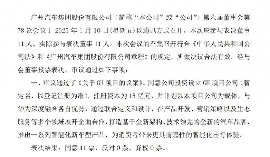 1月10日,廣汽集團(tuán)發(fā)布公告官宣了投資設(shè)立GH項(xiàng)目公司的事項(xiàng)。公告顯示,廣汽將注冊(cè)成立新公司,與與華為深度融合各自優(yōu)勢(shì),通過聯(lián)合定義和設(shè)計(jì),在產(chǎn)品開發(fā)、營(yíng)銷策略以及生態(tài)服務(wù)等多個(gè)領(lǐng)域展開全面合作,打造基于全新架構(gòu)、技術(shù)領(lǐng)先的全新的汽車品牌, 推出一系列智能化新車型產(chǎn)品。新公司的注冊(cè)資本為15億元。