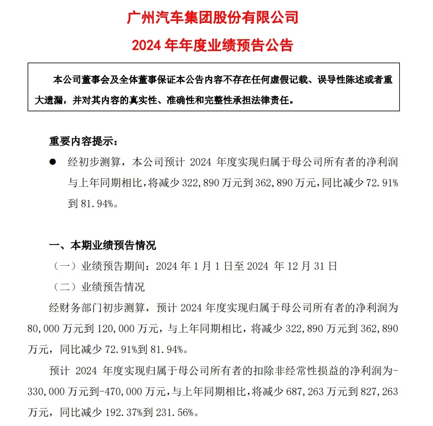 廣汽集團(tuán)2024年年度業(yè)績(jī)預(yù)告公告顯示,預(yù)計(jì)2024年度公司歸母凈利潤(rùn)為8億元-12億元,與上年同期相比,同比減少72.91%-81.94%。